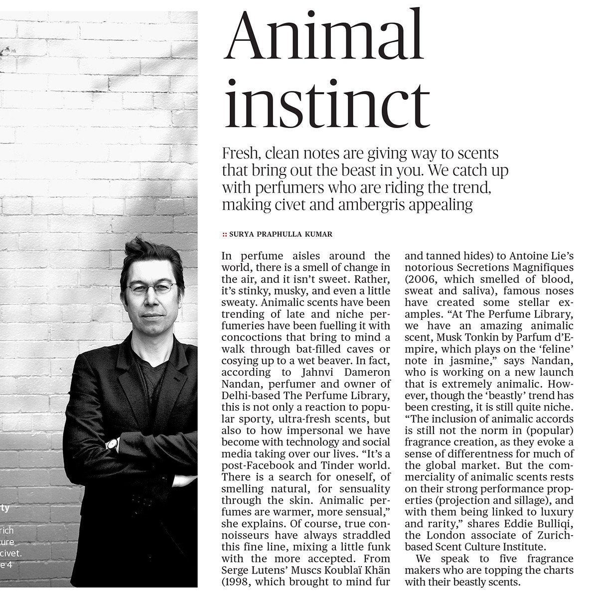 Though she believes working with animalics isn’t more challenging than any other scent — “it’s all a matter of balance — she believes this niche trend is in the forefront, with the mass market slowly catching up. “The early part of this century was dominated by scents that were ‘clean’ and ‘light’. The resurgence of animalic scents is just the fashion cycle coming back around,” says the perfumer, who is currently working on a scent inspired by a musical composition, which will have animalic notes.